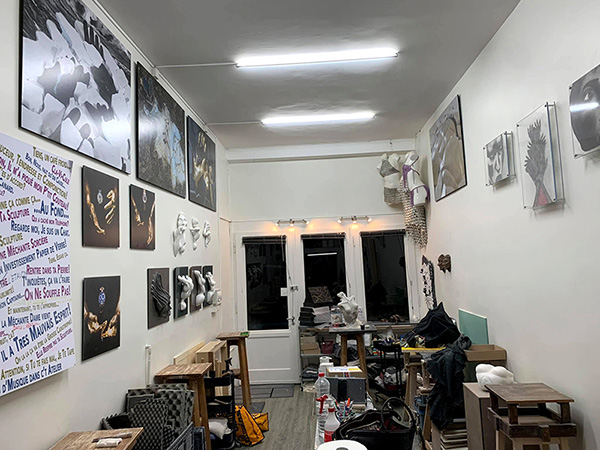 Lausanne. Sur les murs des sculptures ou photos de mes oeuvres. Les sellettes sont situées à 1m50 de distance afin que chacun aie suffisamment d'espace pour travailler.